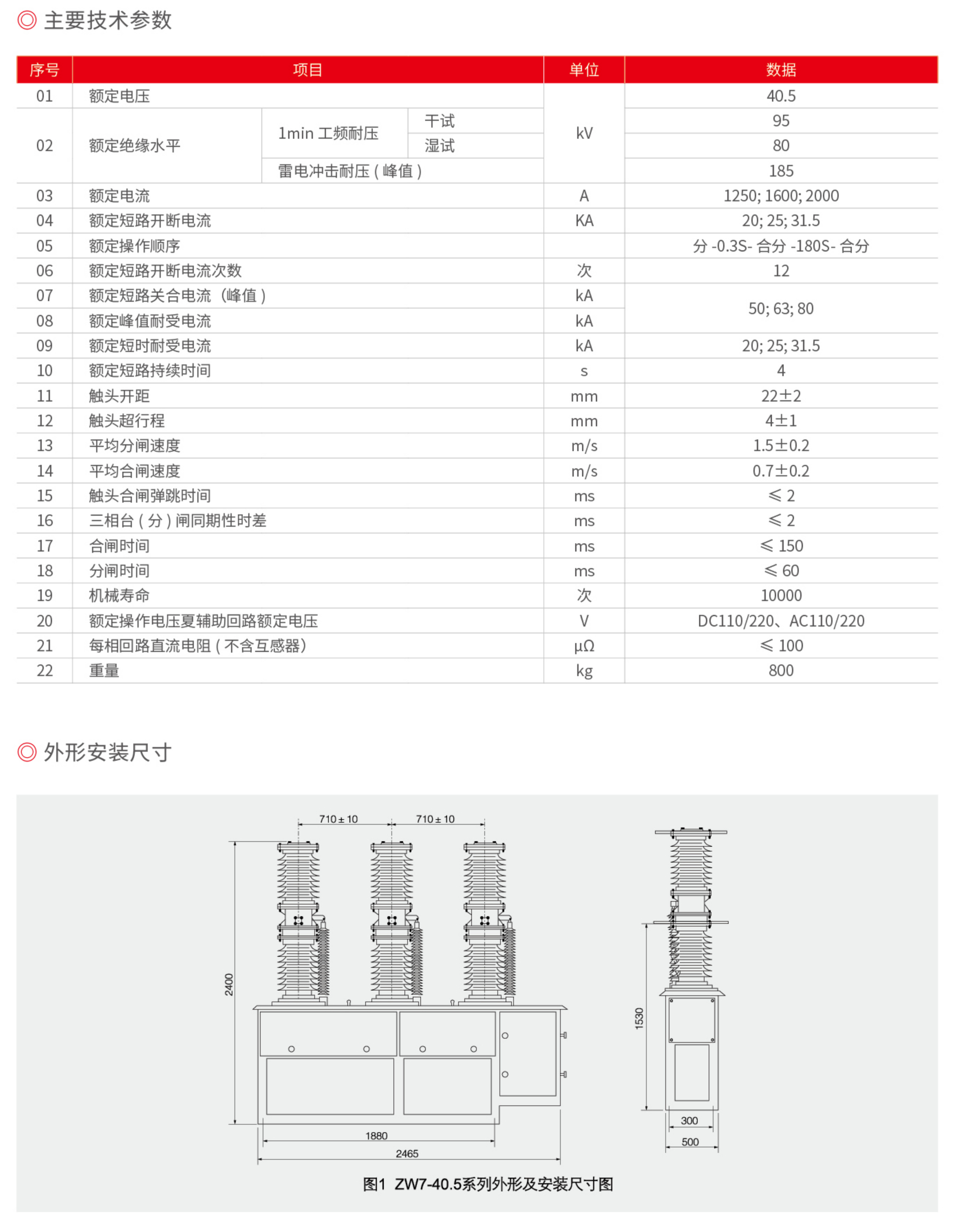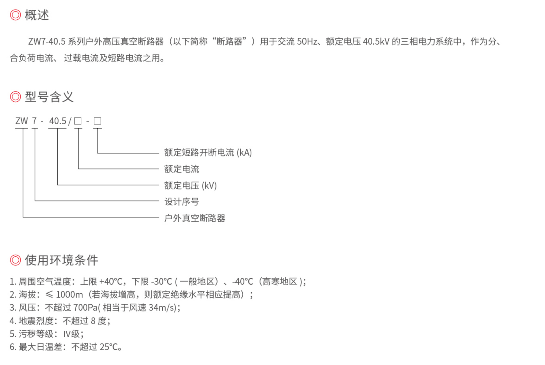 ZW7-40.5系列户外高压真空断路器(以下简称“断路器”)用于交流50Hz、额定电压40.5kV的三相电力系统中,作为分、合负荷电流、过载电流及短路电流之用。
