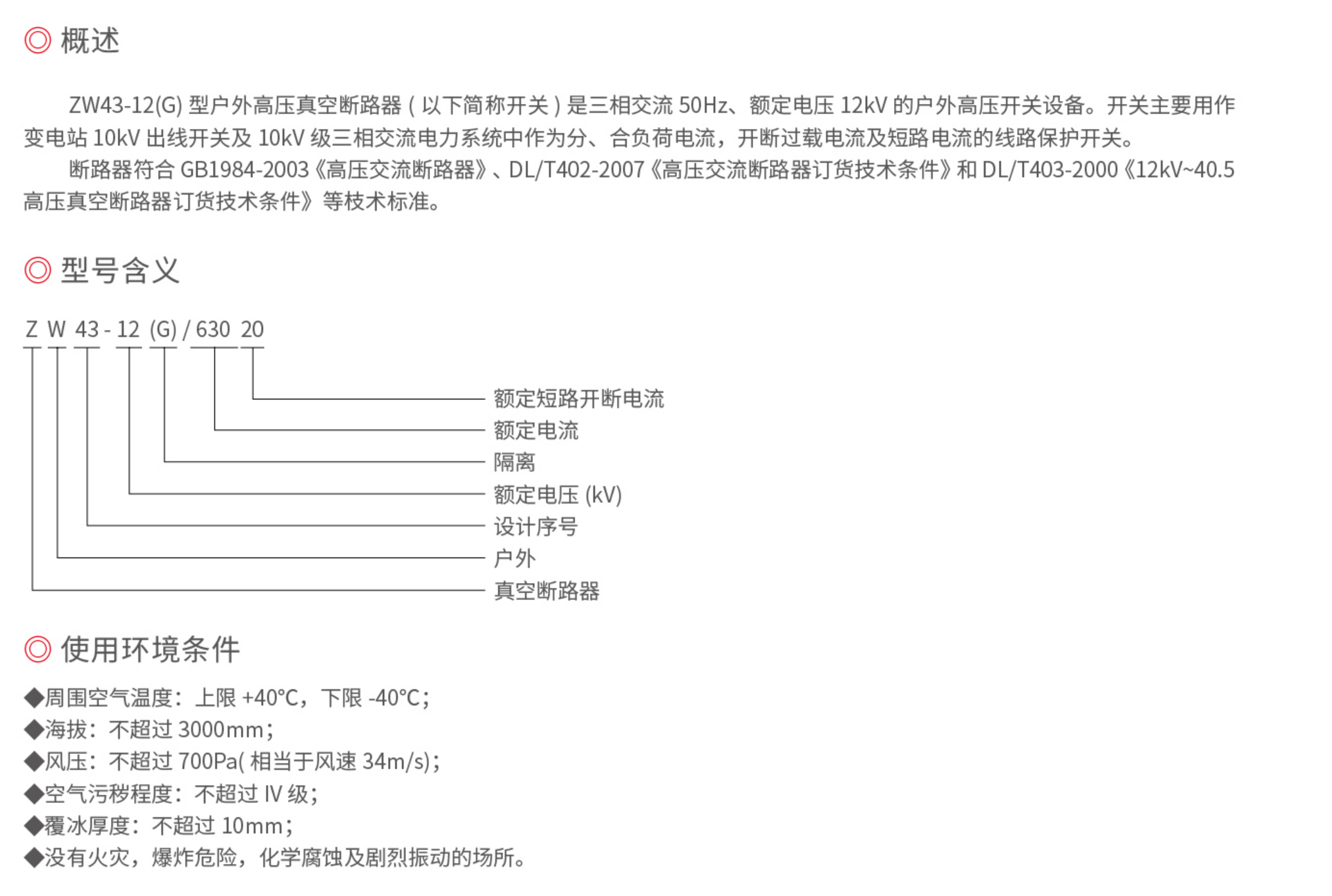 ZW43-12(G)型户外高压真空断路器(以下简称开关)是三相交流50Hz、额定电压12kV的户外高压开关设备。开关主要用作变电站10kW出线开关及10kW级三相交流电力系统中作为分、合负荷电流,开断过载电流及短路电流的线路保护开关。