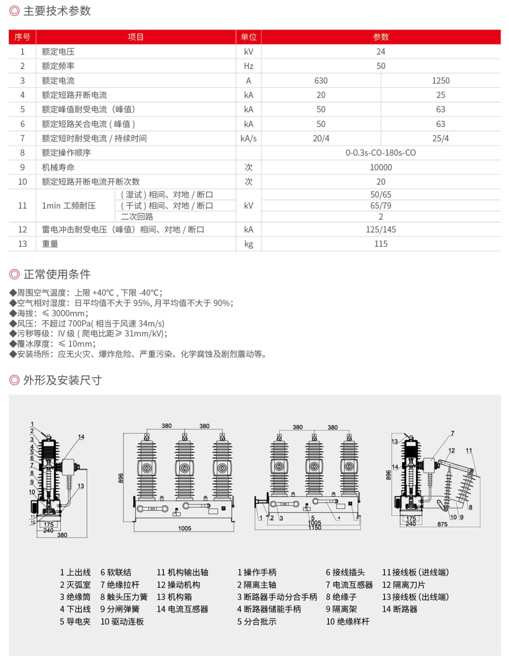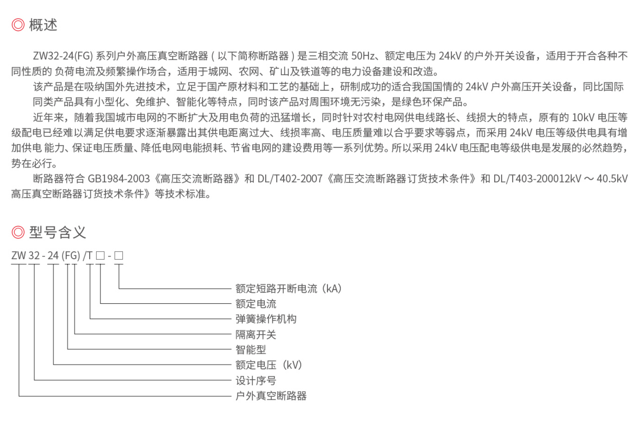 ZW32-24(FG)系列户外高压真空断路器(以下简称断路器)是三相交流50Hz、额定电压为24kV的户外开关设备,适用于开合各种不同性质的负荷电流及频繁操作场合,适用于城网、农网、矿山及铁道等的电力设备建设和改造。该产品是在吸纳国外先进技术,立足于国产原材料和工艺的基础上,研制成功的适合我国国情的24kW户外高压开关设备,同比国际同类产品具有小型化、免维护、智能化等特点,同时该产品对周围环境无污染,是绿色环保产品。
