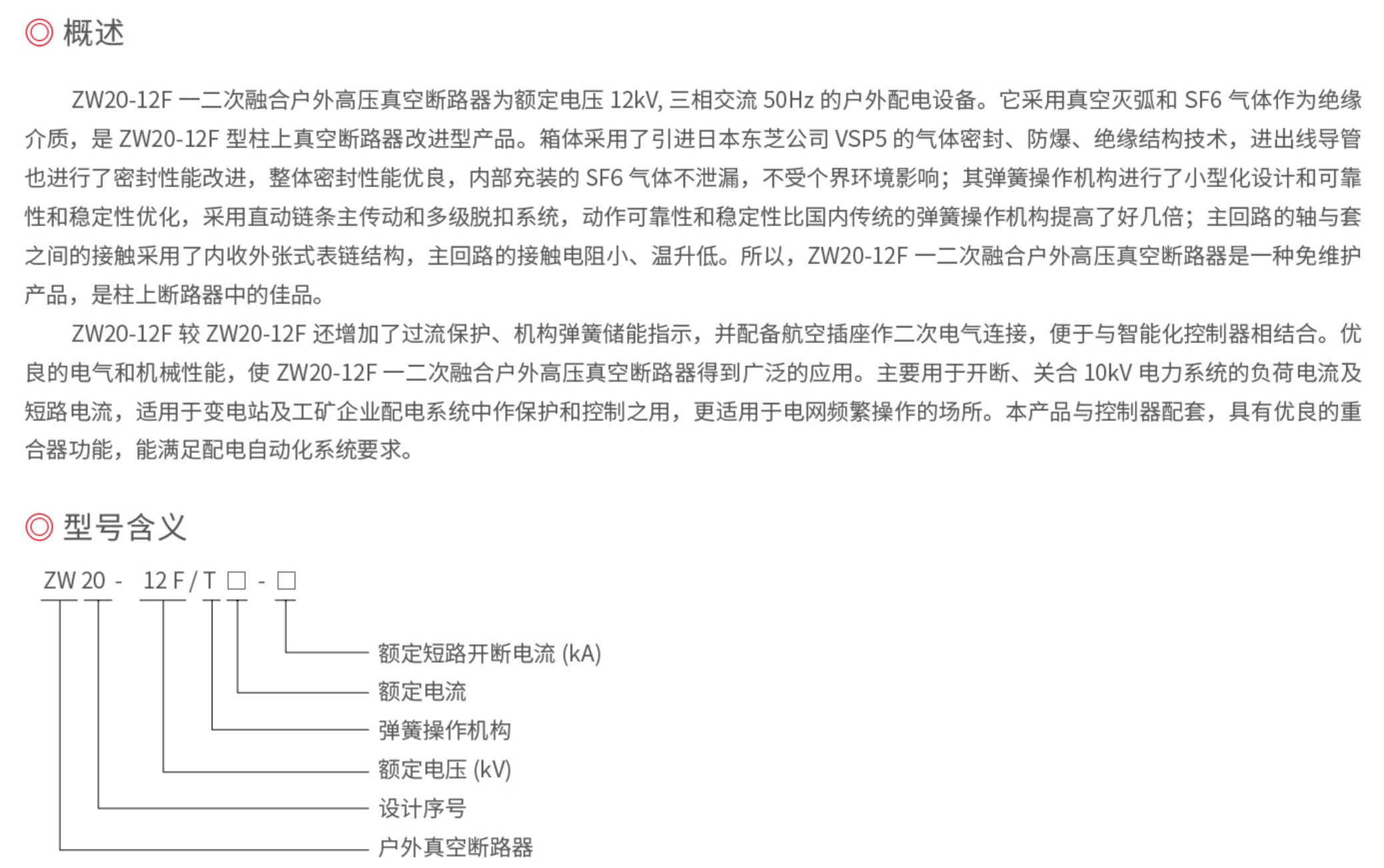 ZW20-12F一二次融合户外高压真空断路器为额定电压12kV,三相交流50Hz的户外配电设备。它采用真空灭弧和SF6气体作为绝缘介质,是ZW20-12F型柱上真空断路器改进型产品。箱体采用了引进日本东芝公司VSP5的气体密封、防爆、绝缘结构技术,进出线导管也进行了密封性能改进,整体密封性能优良,内部充装的SF6气体不泄漏,不受个界环境影响;其弹簧操作机构进行了小型化设计和可靠性和稳定性优化,采用直动链条主传动和多级脱扣系统,动作可靠性和稳定性比国内传统的弹簧操作机构提高了好几倍;主回路的轴与套之间的接触采用了内收外张式表链结构,主回路的接触电阻小、温升低。所以,ZW20-12F一二次融合户外高压真空断路器是一种免维护产品,是柱上断路器中的佳品。