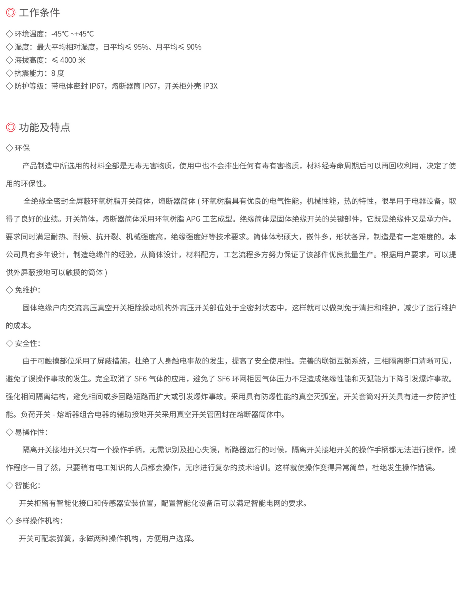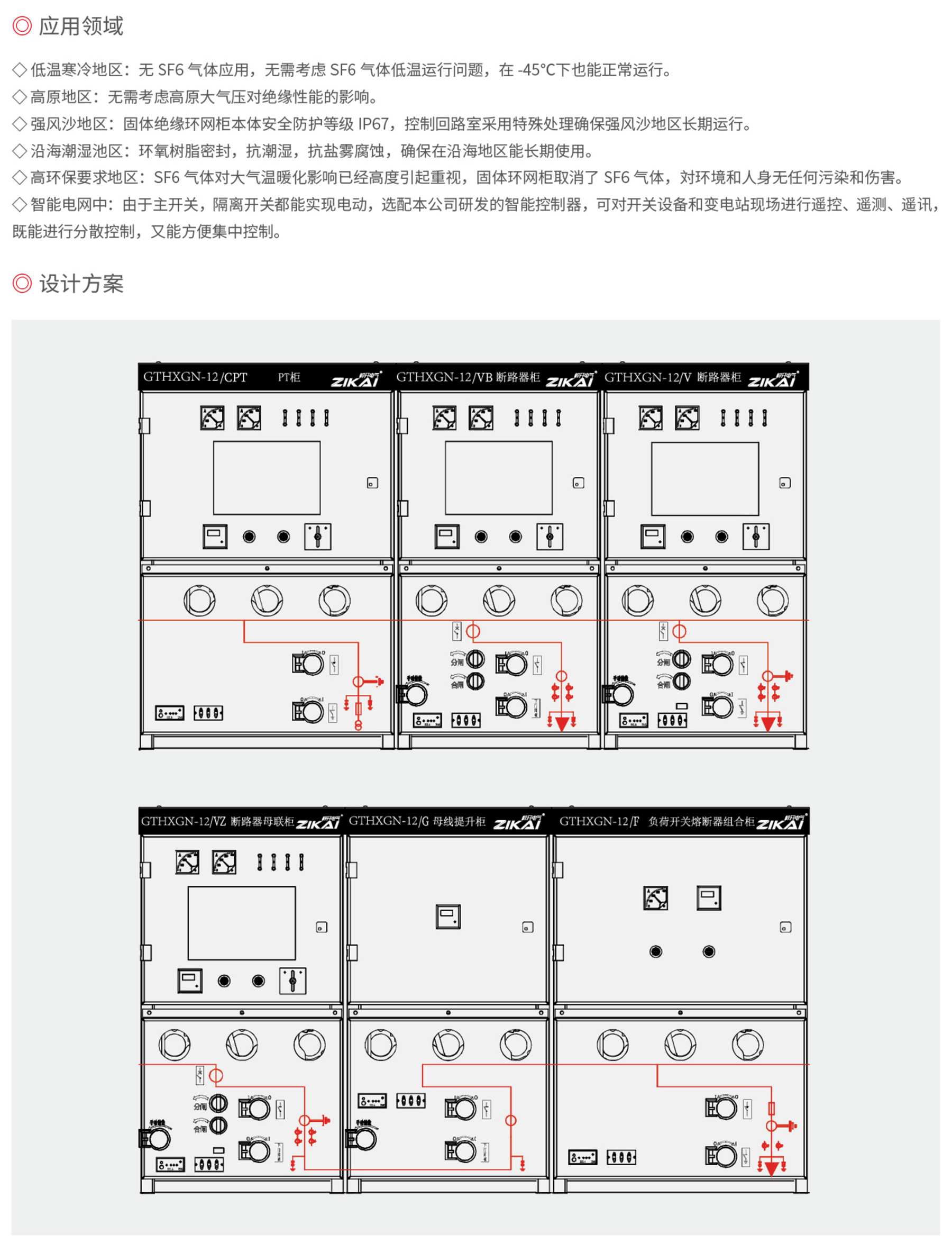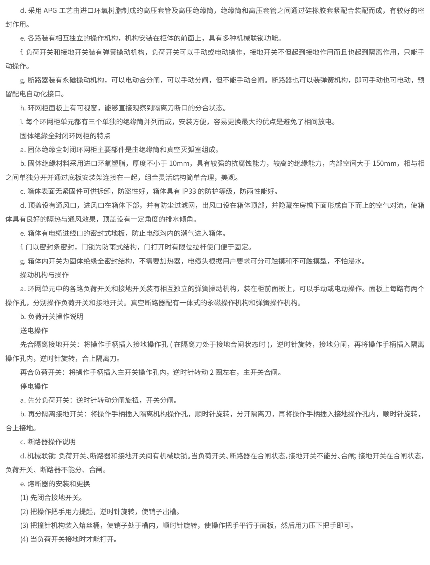 GTHXGN-12固体绝缘环网柜是一种全绝缘、全密封、免维护的固体绝缘真空开关设备。所有高压带电部分均用绝缘性能优良的环氧树脂材料浇注成型,将真空灭弧室、主导电回路、绝缘支撑等有机结合为一整体,功能单元通过全绝缘固体汇流母线连接。因此,整个开关设备不受外部环境影响,可确保设备运行的可靠性和操作人员的安全性。