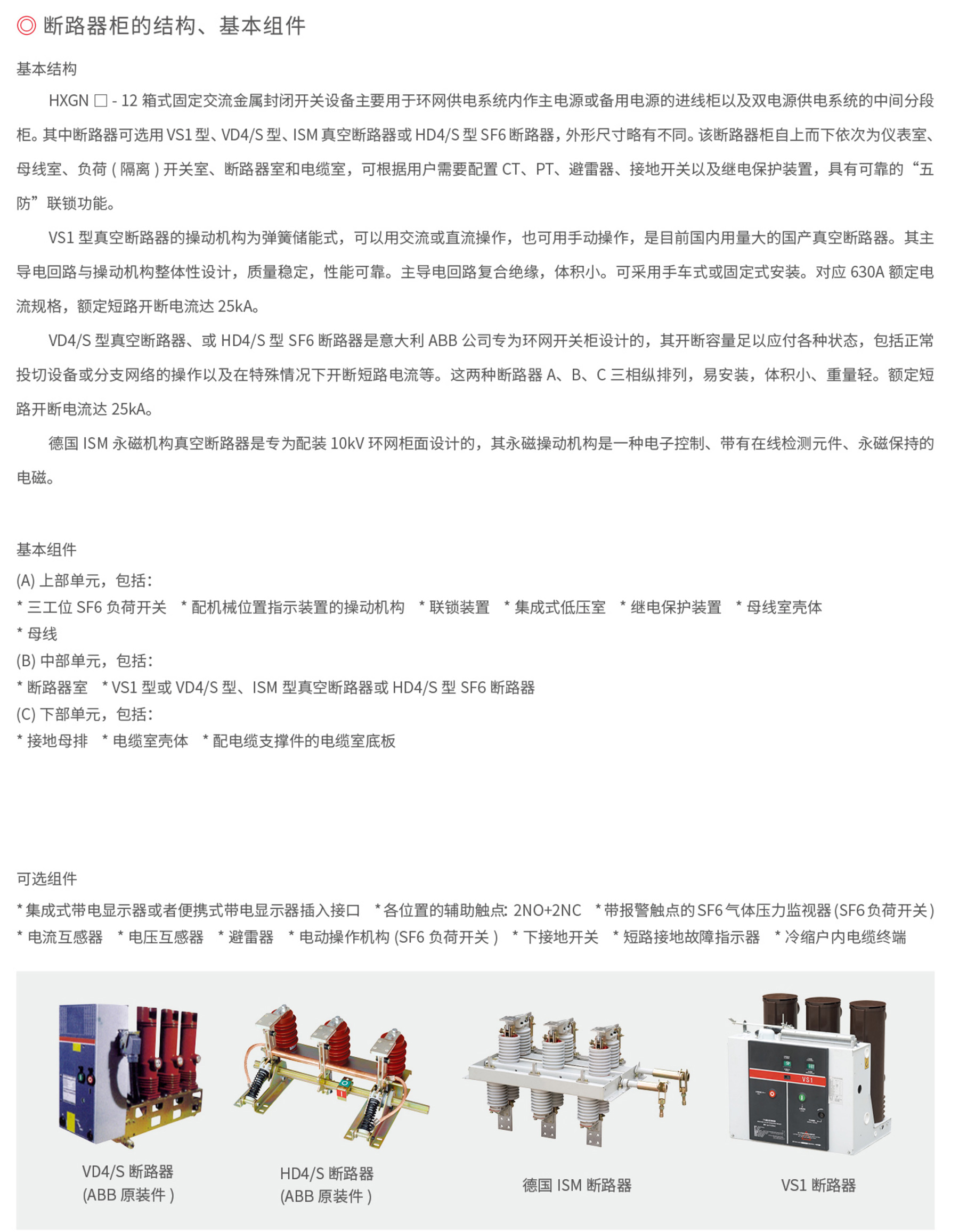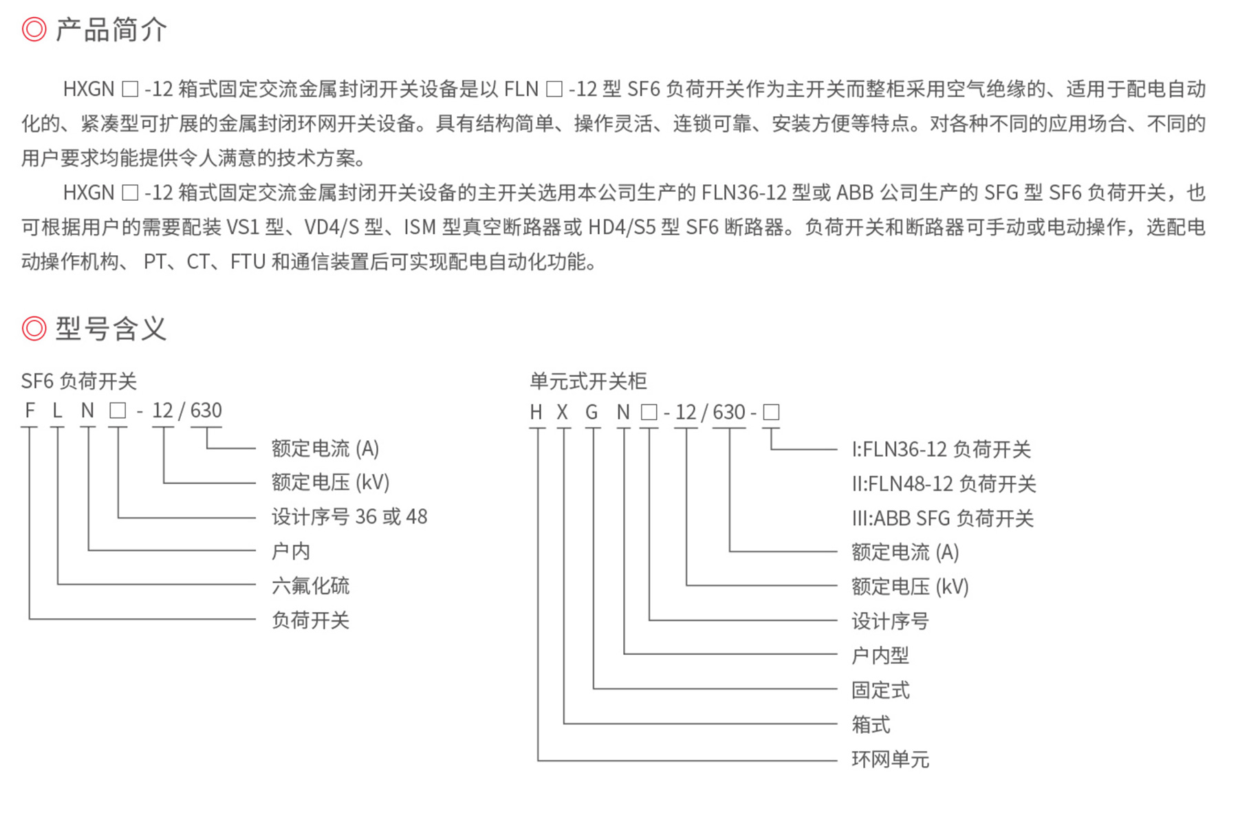 HXGN口-12箱式固定交流金属封闭开关设备是以FLN口-12型SF6负荷开关作为主开关而整柜采用空气绝缘的、适用于配电自动化的、紧凑型可扩展的金属封闭环网开关设备。具有结构简单、操作灵活、连锁可靠、安装方便等特点。对各种不同的应用场合、不同的用户要求均能提供令人满意的技术方案。
