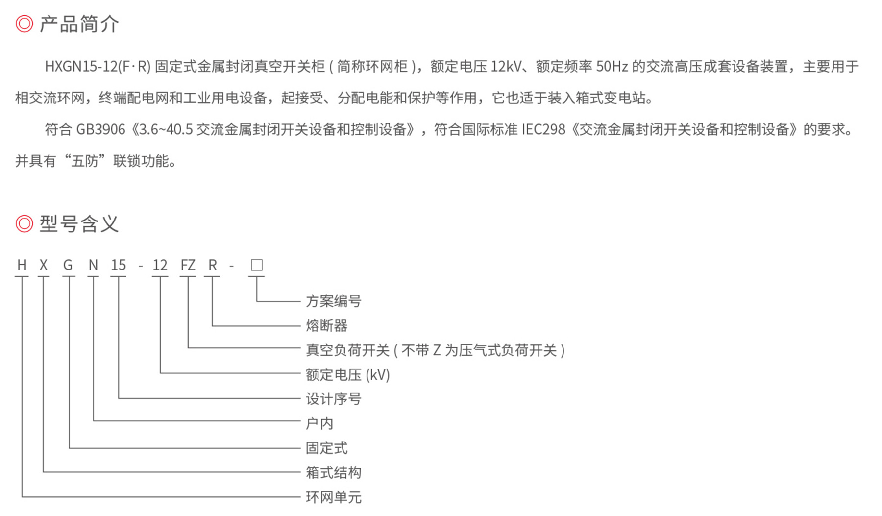 HXGN15-12(F·R)固定式金属封闭真空开关柜(简称环网柜),额定电压12kV、额定频率50Hz的交流高压成套设备装置,主要用于相交流环网,终端配电网和工业用电设备,起接受、分配电能和保护等作用,它也适于装入箱式变电站。