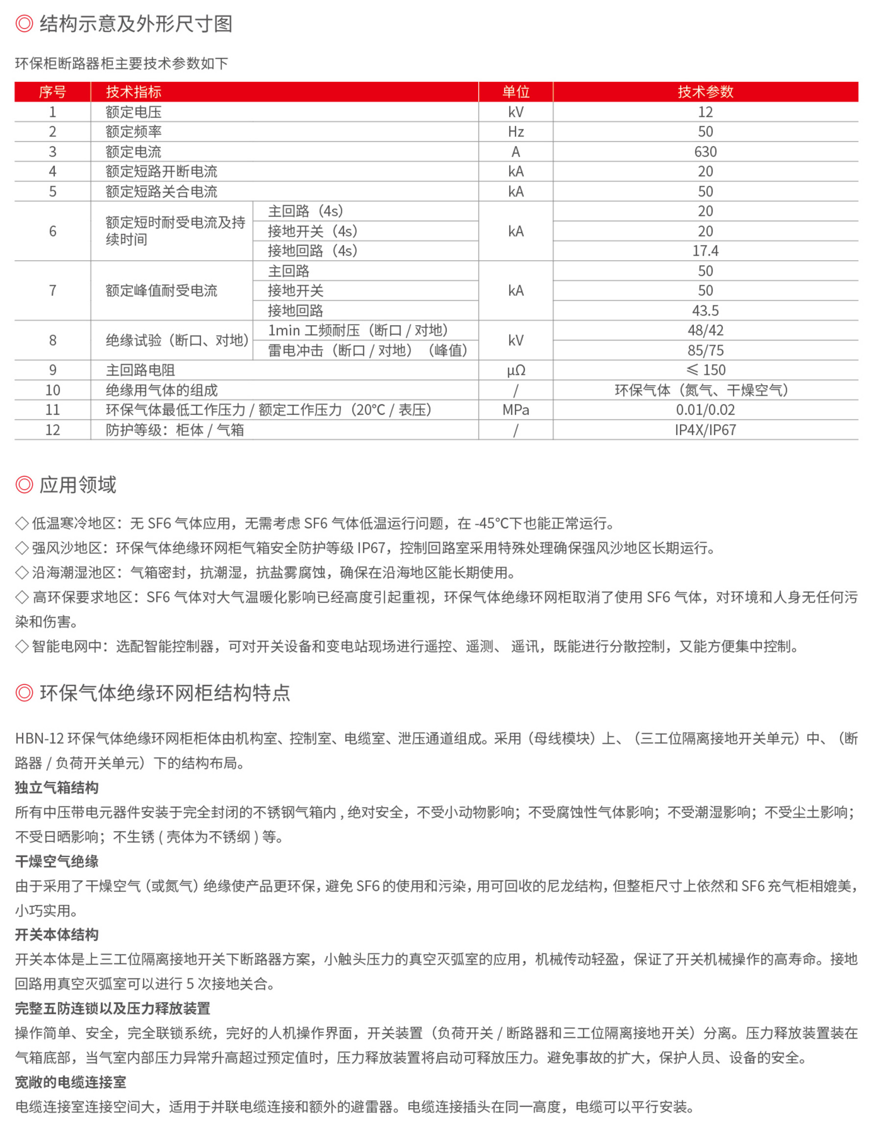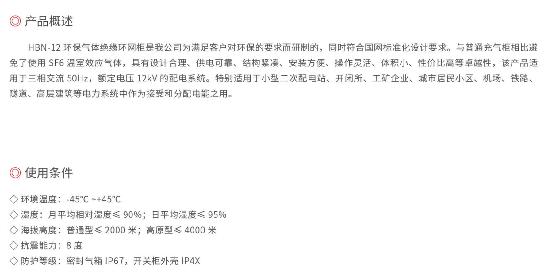HBN-12环保气体绝缘环网柜是我公司为满足客户对环保的要求而研制的,同时符合国网标准化设计要求。与普通充气柜相比避免了使用SF6温室效应气体,具有设计合理、供电可靠、结构紧凑、安装方便、操作灵活、体积小、性价比高等卓越性,该产品适用于三相交流50Hz,额定电压12kV的配电系统。特别适用于小型二次配电站、开闭所、工矿企业、城市居民小区、机场、铁路、隧道、高层建筑等电力系统中作为接受和分配电能之用。
